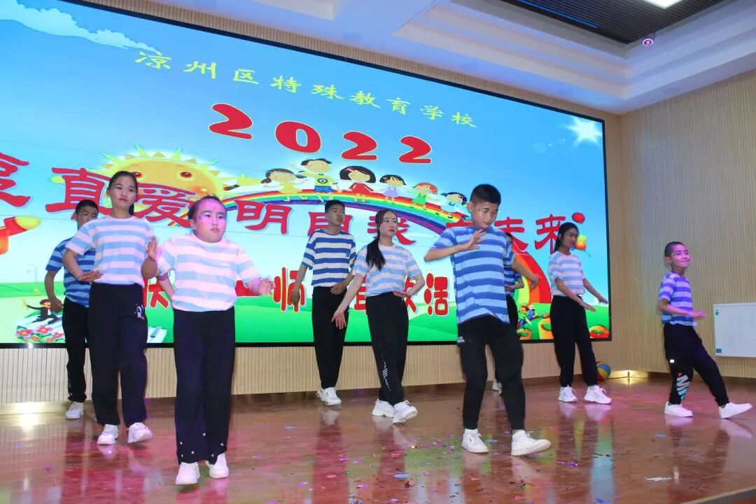 在凉州区特殊教育学校,师生同台演出的文艺节目可谓群星闪耀,精彩纷呈,让人目不暇接,拍手称赞。情景舞蹈《西瓜娃娃醒八戒》、走秀《低碳生活时装秀》、现代舞《青春修炼手册》等洋溢着青春活力的气息,用动感的舞步踏出自信风采。一首首师生联唱让所有人都品味到了童年的多姿多彩、幸福快乐。特殊儿童们也用歌舞《中国字 中国人》《最好的未来》《红星闪闪》等节目表达出内心的喜悦。